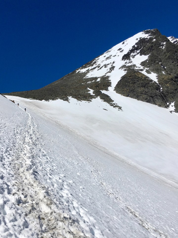 The view from the first basin was magnificent, with a sweeping vista of Kebnekaise peak itself surrounded by steep couloirs and cascading glaciers. As the day had now warmed up, chunks of cornice started melting and tumbling off the peak, setting off avalanches in the process and filling the basin with sporadic roars – luckily well away from the path to the summit.