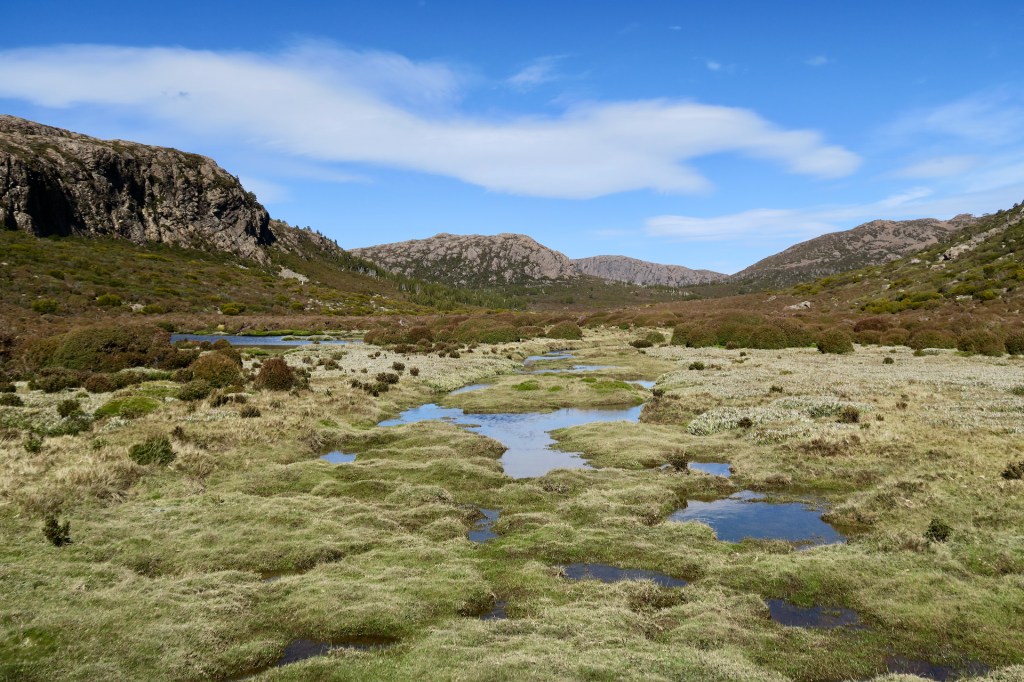 The trailhead starts from a newly built car park about 2hrs drive from Launceston, and the initial hike up to the plateau is probably the hardest slog of the route, taking about 1.5hrs to walk the first 3km as you ascend 500m vertical. I’d initially packed in a couple of full water bottles, but once I saw all the streams were running I emptied one bottle to lighten my pack weight. Once you’re just above the Trapper’s Hut, it’s a relatively mellow stroll along a well cut path through alpine lakes on the way to Wild Dog Creek campsite. This is a well established camping area with a pit toilet, camping platforms and plenty of running water nearby.