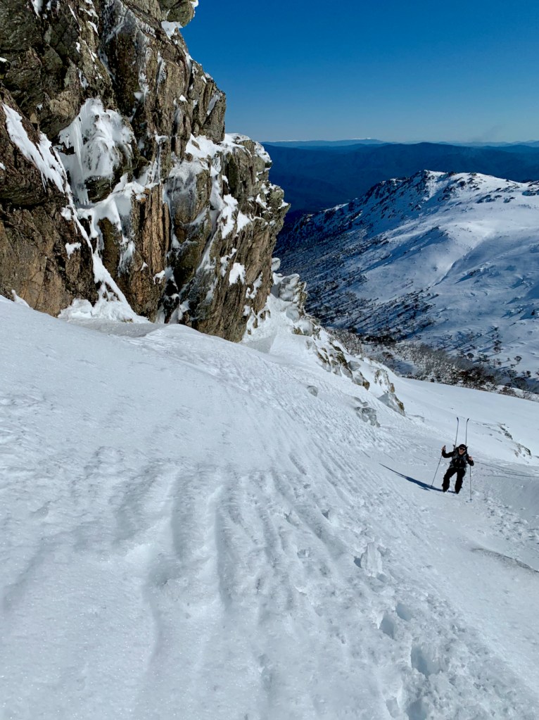 The climb back out of Leatherbarrel is always less fun than the run down, and we figured bootpacking back up The Corrie would be easier than slip-sliding on skins up the creek, with some added excitement as ice and rocks started melting off the cliffs above us! We then had to keep our skins on to have some grip on the ice all the way back downhill to Thredbo.