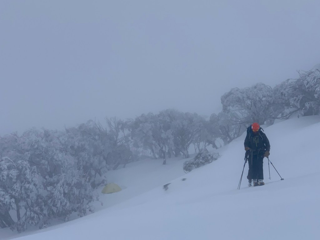 A couple of weeks later, what looked to be the storm of the season loomed – the first properly cold system with forecasts of over a metre of snow likely. So, back to the mountains and a plan to storm-ski the resort before heading out for some camping to score the first bluebird day after the storm. This meant buying a lift ticket at full Covid and weekend pricing rates, including Ski Tube for a grand total of $225 – the most I’ve ever spent on a day’s skiing that doesn’t involve helicopters! After a fun Saturday tree skiing, we headed out in the back end of the storm on Sunday morning and set up camp near South Ramshead before an afternoon storm skiing the trees.