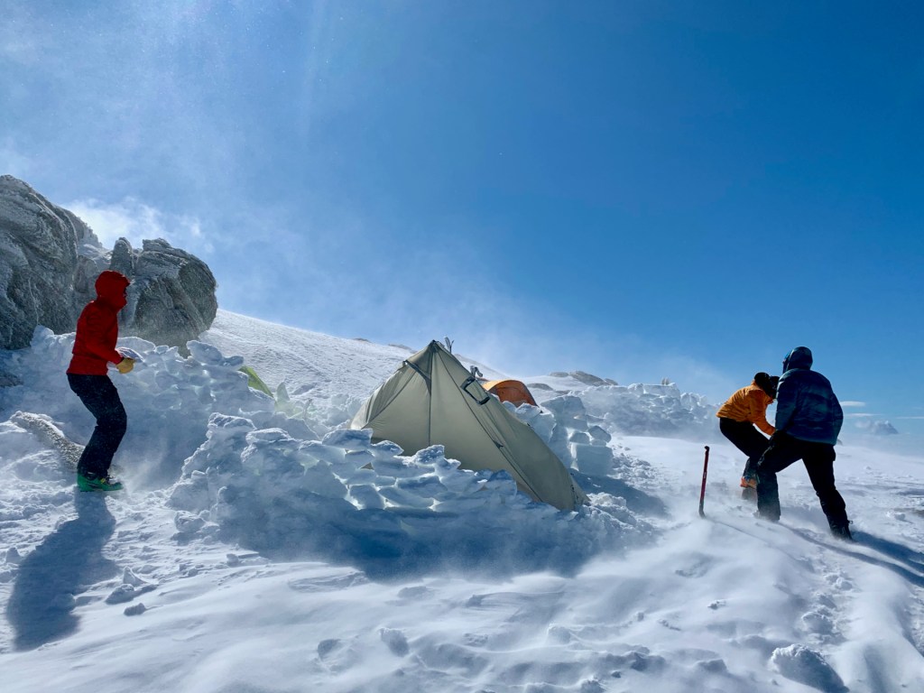 This all changed shortly after midnight when the prevailing Northerly wind swung West, eliminating any shelter we had from the rocks we’d camped behind as the wind pushed towards 100kmh gusts. Amazingly, all the tents held fast, but we got stuck into building snow walls at first light to give us some reprieve lest it continued through the day. Of course, the moment we’d finished a couple of hours of intense wall building, the wind abated and we could start thinking about going skiing! It was a good lesson about being too complacent about the weather forecasts and being prepared for rapid changes in the high alpine.
