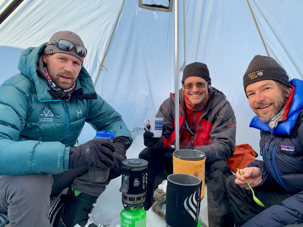 This trip’s crew were all very experienced alpinists, so I was happy to just keep up and listen to some amazing stories over a tasty freeze dried meal and nips of tightly rationed whiskey! We’d also brought a cheap pyramid tent to use as a kitchen which provided us with much more cosy evenings than freezing outside.